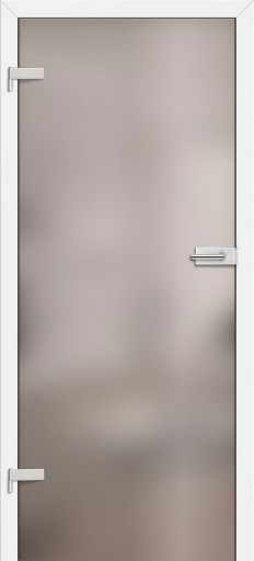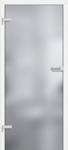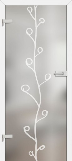 DRZWI WEWNĘTRZNE FIRMY ERKADO, SZYBA HARTOWANA 8 MM. SZKŁO MLECZNE Z WZORAMI MALOWANYMI NA CZARNO.