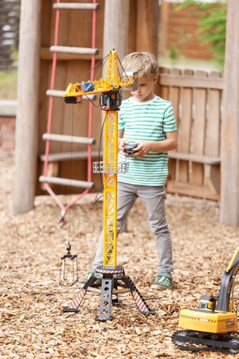 Dickie Mega dźwig to wielka zabawka zachwycająca chłopów. Wolno stojący żuraw budowlany ma aż 120 centymetrów wysokości. Jest sterowany przy pomocy pilota, co zapewnia świetną zabawę. Dźwig ma ramię obracające się o 360 stopni. Do otwieranej kabiny może wejść operator dźwigu. W zestawie z mega dźwigiem znajdują się również dodatki takie jak uchwyt i platforma ładunkowa. Możemy na nią załadować towary, wciągnąć na górę i przełożyć na druga stronę gdzie je ponownie opuścimy. To wspaniałą sterowana zabawka, która zachwyci chłopców i ogromnie wciągnie w zabawę w ładowanie i przenoszenie towarów.