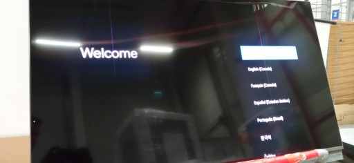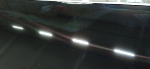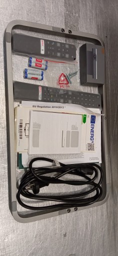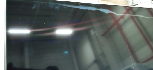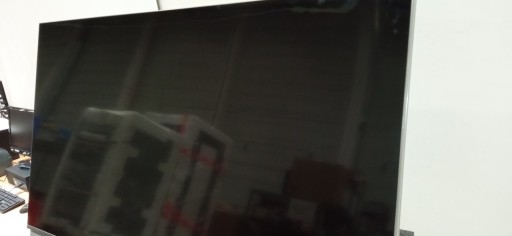 Stan produktu: Towar uszkodzony, rozpakowany, uszkodzony pasek matrycy w górnej części telewizora, dwie pionowe kreski na środku matrycy, ślady montażowe
