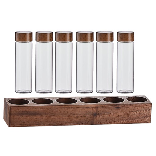 ✅ Drewniany stojak może zarówno pomóc w przechowywaniu szklanych tubek na ziarna kawy, jak i nadaje się do użytku ekspozycyjnego.