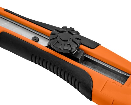 Nóż z ostrzem łamanym 18 mm, blokada śrubowa 63-014 marki NEO posiada szerokość 18 mm. Metalowe prowadnice ostrza zabezpieczają użytkownika przed niekontrolowanym wysuwaniem się wkładu, a blokada śrubowa dodatkowo wpływa na jego bezpieczeństwo. Narzędzie posiada trwały korpus wykonany z tworzywa sztucznego i pokryty antypoślizgową okładziną, zapewniającą pewny chwyt. Sprawdzi się zarówno w zastosowaniach domowych jak i profesjonalnych.