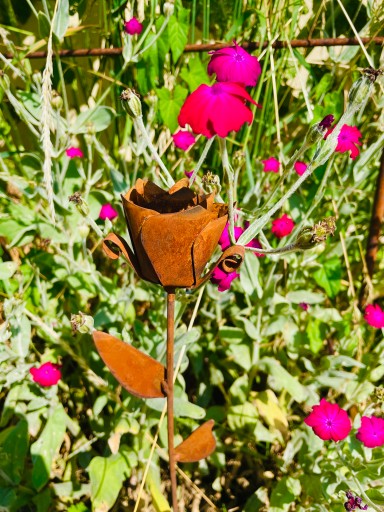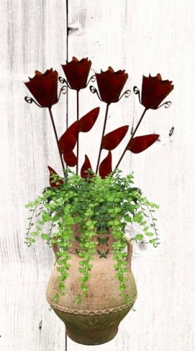 - Nasze kwiatowe dekoracje wykonane są z wysokiej jakości metalu i pokryte piękną, naturalną patyną. Dzięki temu, posiadają rustykalny wygląd i zachwycającą autentyczność, idealnie wpasowującą się w atmosferę ogrodu lub wnętrza doniczek.