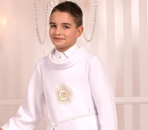 Alba komunijna z kapturem Juliusz..z haftem hostii, w kolorze srebrnym lub złotym oraz sznurem białym lub złotym do wyboru.