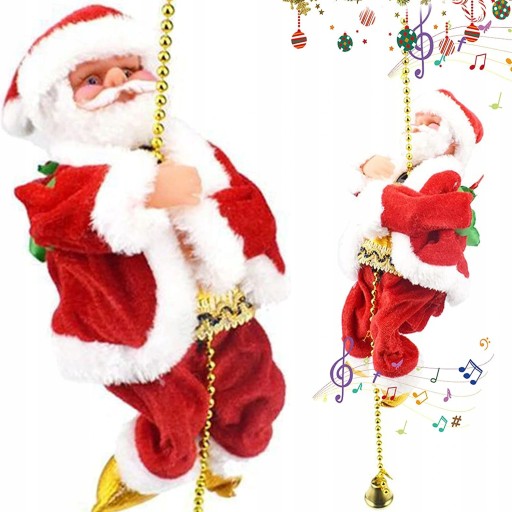 Święty Mikołaj wspina się po koralikach, a następnie wielokrotnie schodzi z muzyką.
