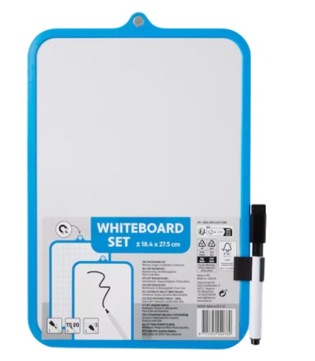 - Tekst zapiszesz przy pomocy czarnego markera , który znajduje się w zestawie a tekst usuniesz dzięki załączonej do pisaka gąbce