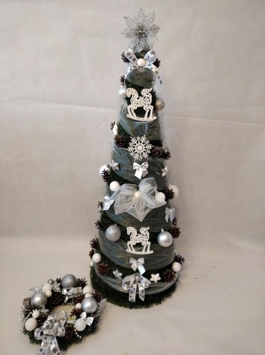 jest wykonana na sztucznej choinie która jest na podkładzie z rączką tzw. wieniec.