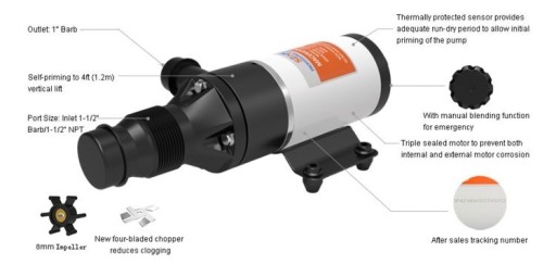 Seaflo SFMP1-120-01 to wydajna pompa z rozdrabniaczem do fekaliów, przeznaczona do montownia na jachtach, w kamperach i przyczepach kempingowych oraz wszędzie tam, gdzie odprowadzenie nieczystości z toalet lub kuchni wymaga pompowania na wyższy poziom (do 5 m). Wysokojakościowy silnik z nową konstrukcją bezspoinową obudowy, odporną wodę rozbryzgową. Wirnik pompy z uszczelnieniem obudowy łożyska w postaci o-ringu.