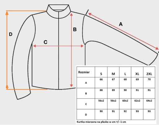 Szerokość pod pachami: S 55cm x2 M 57cm x2 L 61cm x2 XL 63cm x2 2XL 66cm x2 3XL 68cm x2