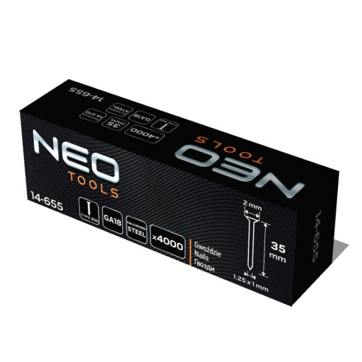 - Galwanizowane gwoździe do zszywacza pneumatycznego marki NEO o długości 35 mm, GA18 w typie 300 (F).