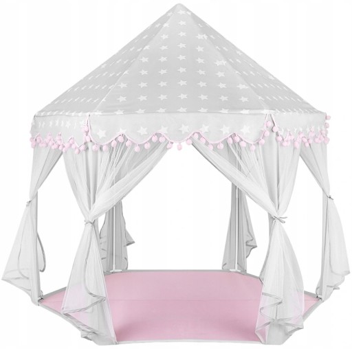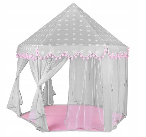 Oferujemy zupełnie, nowy, ulepszony model namiotu. Zastosowaliśmy połączenie koloru różowego i szarego z motywem gwiazdek na daszku. Dodatkowo na falbankach znajdują się przepiękne różowe pomponiki, które jeszcze bardziej go uatrakcyjniają.