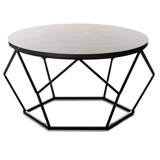 Duży oryginalny stolik kawowy. Podstawa wykonana z lekkiej, metalowej konstrukcji lakierowanej na czarno, która tworzy ciekawą sześcioboczną bryłę. Blat wykonany z masywnej płyty MDF w kolorze czarny MARMUR. Całość zachowana w stylu LOFT, zatem będzie się idealnie komponowała w surowych wnętrzach. Wykonany z wysokiej jakości materiałów, odpornych na zniszczenia. Luksusowy charakter i elegancki design sprawią, że będzie wyróżniającym się punktem każdej aranżacji, wywołując zachwyt u nawet najbardziej wymagających osób. Stolik produkowany jest w Polsce.