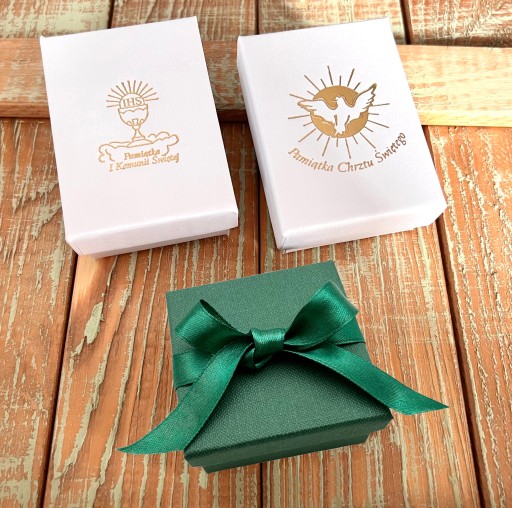 Po zakupie usługi dodatkowej do zamówienia zostanie dołączony zestaw opakowania premium: pudełko na biżuterię z indywidualną dedykacją oraz torebka prezentowa. Do wyboru pudełko z okazji Komunii Świętej, Chrztu Świętego oraz uniwersalne. Dedykacja drukowana jest na złotym, błyszczącym papierze, który jest zintegrowany z pokrywą pudełka. Aby zapobiec przypadkowemu otwieraniu się, zastosowaliśmy zamknięcie na magnes – proste i skuteczne rozwiązanie.