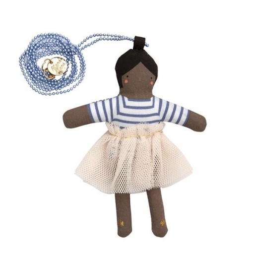 Ten naszyjnik jest absolutnie uroczy! Składa się z pięknie wykonanej lalki o imieniuRubyi niebieskiego łańcuszka z koralików. Lila jest wykonana z bawełny, ma ładną spódniczkę z brzoskwiniowego tiulu.