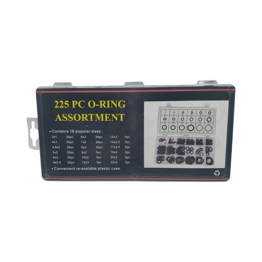 Zestaw oringów uszczelniających olejoodpornych w 18 różnych rozmiarach. Zestaw zawiera aż 225 sztuk, które zostały skatalogowane i zamknięte w plastikowym organizerze pozwalającym na wygodne przechowywanie i korzystanie z uszczelek.