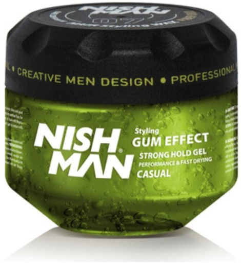 NishMan Styling Gel Gum Effect Casual silny żel do włosów z efektem gumy. Został specjalnie opracowany, aby zapewnić maksymalne utrwalenie i długotrwałą kontrolę. Ten bezalkoholowy żel do włosów jest niezbędny do tworzenia ekstremalnych stylizacji i strukturalnych kształtów. Można go łatwo usunąć poprzez czesanie lub mycie.