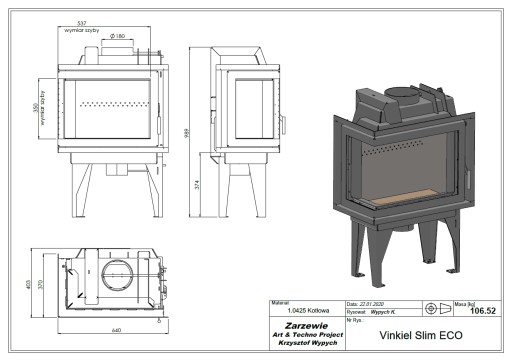 Wkład kominkowy Zarzewie Vinkiel Slim Eco wykonany ze stali kotłowej o grubości ścianki 4mm w technologii CNC: