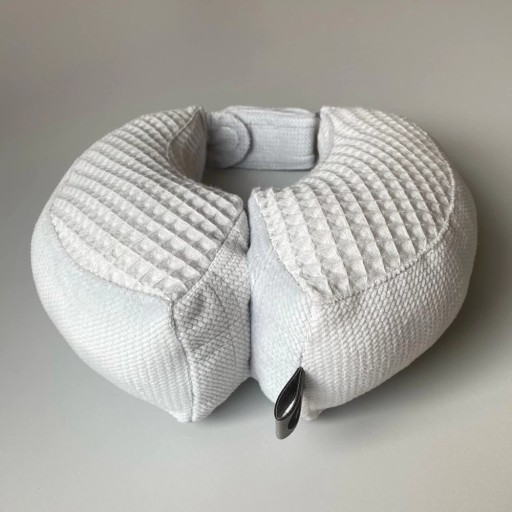 Poduszka zawiera dodatkową regulację w tylnym zapięciu. Za pomocą rzepa można ustalić odpowiednią długość zapięcia co pozwoli dopasować obwód poduszki do obwodu szyi dziecka.