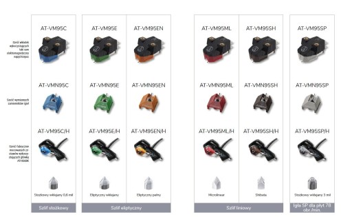 Wszystkie sześć wkładek gramofonowych z linii VM95 korzysta z takiego samego elektromagnetycznego układu napęd-korpus, dlatego każdy z zamienników igieł jest w pełni kompatybilny z wkładkami AT-VM95.