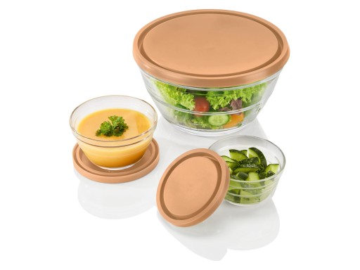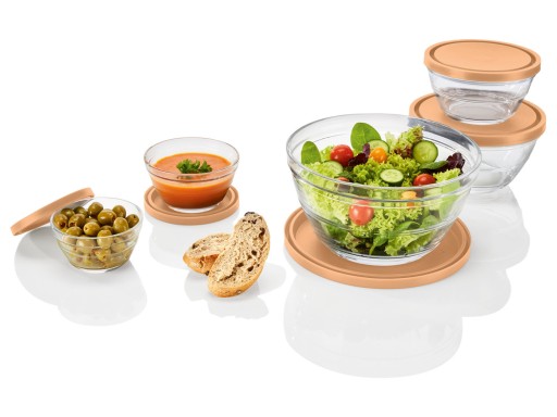 Zestaw szklanych misek z zielonymi pokrywkami o średnicy od 9 do 17 cm. Miseczki mają pojemność od 210 do 2320 ml. Maksymalna temperatura ich użytkowania to 70°C. Miski zostały wykonane z trwałego i przezroczystego szkła. Dzięki ściśle przylegającym pokrywkom dobrze zabezpieczysz przechowywane jedzenie przed zanieczyszczeniem lub aromatami w lodówce.