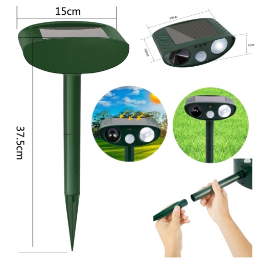 Na górnej części odstraszacza szkodników umieszczony został panel słoneczny. Generowane fale są niesłyszalne dla ludzi, ale irytujące dla zwierząt.