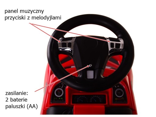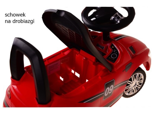 Kierownica na której znajdują się muzyczne przyciski zaciekawi nawet najbardziej wymagające dziecko, schowek umiejscowiony pod siedzeniem umożliwi naszemu maluchowi zabranie ze sobą swoje ulubionych skarbów bez konieczności noszenia ich przez rodziców.