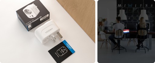 Minimalistyczny design adaptera światowego Voomy ułatwia jego schowanie w torbie lub walizce. Bez trudu mieści się w bagażu, gotowy do podróży.