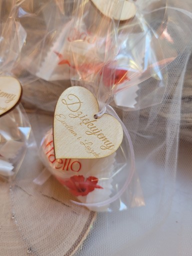 Rafaello zapakowane w torebeczkę i ozdobione grawerowanym serduszkiem z napisem dziękują.