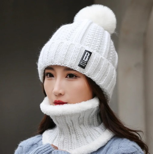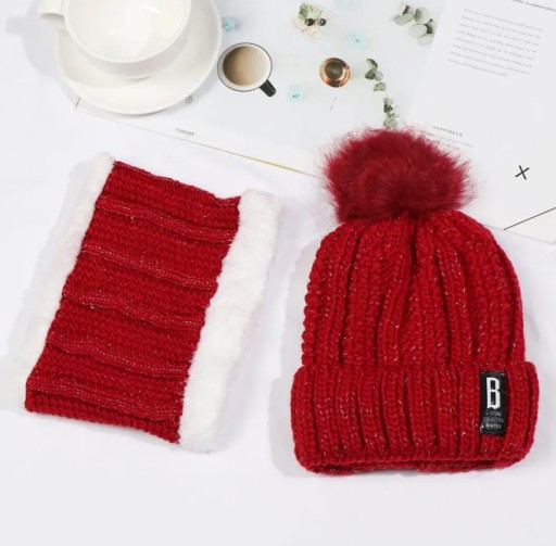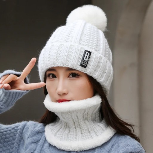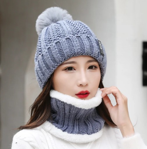Klasyczny i uniwersalny komplet zimowy, składający się z czapki z pomponem i komina.