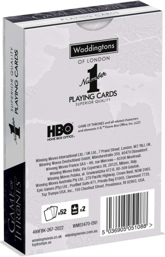 Klasyczna talia 55 kart z wizerunkiem bohaterów Game of Thrones to najpopularniejsze karty dystrybuowane przez firmę Winning Moves. Ta rodzinna talia kart umili niejedno popołudnie i niejeden wieczór w gronie przyjaciół.
