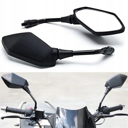 Czarne matowe lusterka o nowoczesnym designie. Mocowane są na solidnym metalowym uchwycie o średnicy gwintu 10 mm. Posiadają możliwość przegubowej regulacji kąta widzenia, dzięki której możliwe jest indywidualne dopasowanie ustawień do własnych potrzeb. Wyposażone są w otwory umożliwiające odprowadzanie wody.