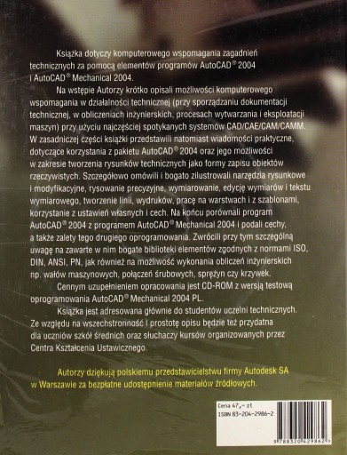 Książka dotyczy komputerowego wspomagania zagadnień technicznych za pomocą elementów programów AutoCAD 2004 i AutoCAD Mechanical 2004.Cennym uzupełnieniem opracowania jest CD-ROM z wersją tekstową oprogramowania AutoCAD Mechanical 2004.