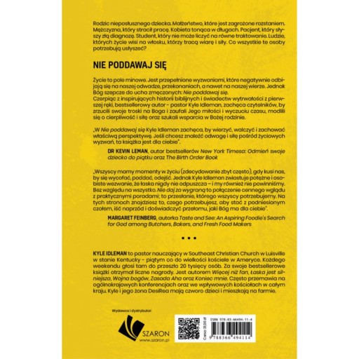 Rodzic nieposłusznego dziecka.Małżeństwo, które jest zagrożone rozstaniem.Mężczyzna, który stracił pracę.Kobieta tonąca w długach.Pacjent, który słyszy złą diagnozę.Student, który nie może liczyć na równe traktowanie.Ludzie, których życie wisi na włosku, którzy tracą wiarę i siły.Co wszystkie te osoby potrzebują usłyszeć? NIE PODDAWAJ SIĘŻycie to pole minowe. Jest przepełnione wyzwaniami, które negatywnie odbijają się na naszej odwadze, przekonaniach, a nawet na naszej wierze. Jednak Bóg szepcze do ucha zmęczonych: Nie poddawaj się. Czerpiąc z inspirujących historii biblijnych i świadectw wytrwałości z pierwszej ręki, bestsellerowy autor - pastor Kyle Idleman, zachęca czytelników, by zrzucili swoje troski na Boga i zaufali Jego miłości i wyczuciu czasu, modlili się o cierpliwość i siłę oraz szukali wsparcia w Bożej rodzinie.