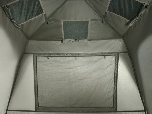 Kolejną dużą zaletą jest rozbudowany system wentylacji, który składa się z kilku okien i osłony. Obszerna moskitiera umieszczona jest zarówno na przedniej, jak i tylnej ścianie, a cztery mniejsze okna znajdują się bezpośrednio w suficie namiotu. Dzięki temu powietrze może przepływać do środka, gdy nie możesz przewietrzyć całego namiotu za pomocą dużych okien. Z pewnością docenisz to w nocy, kiedy pomoże to zmniejszyć skraplanie się pary wodnej na wewnętrznych ścianach. Daszek nad wejściem stanowi dodatkową ochronę przed słońcem i deszczem. Dach jest przymocowany do całej konstrukcji za pomocą szeregu klipsów, aby uniknąć niepotrzebnych ruchów spowodowanych wiatrem. CUBICON posiada również 4 stabilizujące linki i kołki w pakiecie, a także standardową podłogę mocowaną za pomocą wysokiej jakości zamka błyskawicznego na całym obwodzie. Koniec z brudem i niechcianymi wizytami gryzoni!