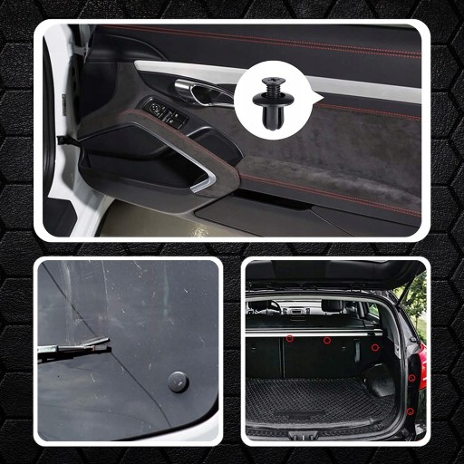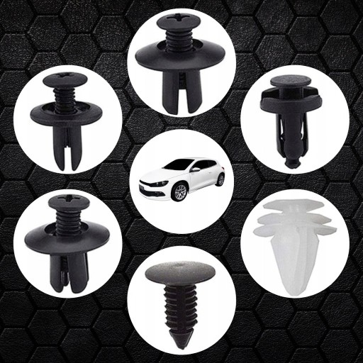 Zestaw składający się z różnego rodzaju elementów, takich jak spinki, kołki, klipsy i zatrzaski, przeznaczony do mocowania różnych części w samochodach, takich jak tapicerka, elementy plastikowe, zderzaki i uszczelki, dostępny w uniwersalnych rozmiarach, które są powszechnie stosowane w większości marek samochodów.