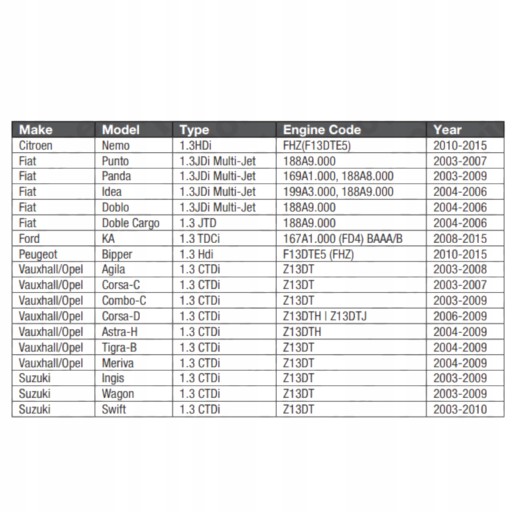 - OPEL: A13DTC , A13DTR , A13DTE , Y13DT , Y13DTH , Z13DT , Z13DTE , Z13DTH , Z13DTI , Z13DTJ , Z13DTR ,