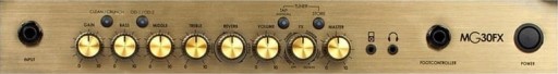 Kontrola: Gain, clean/crunch select, bass, OD1/OD2 select, middle, treble, reverb, volume, tuner, tap, store, FX select, master volume