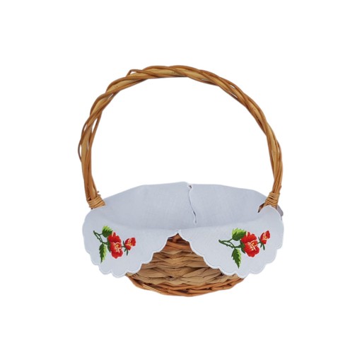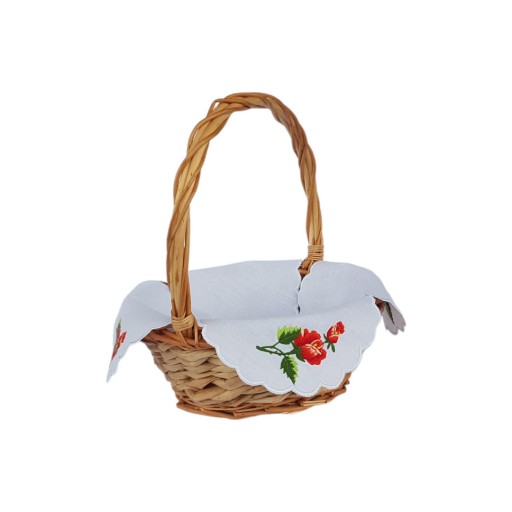 Biała serwetka do koszyczka wielkanocnego ozdobiona haftem łowickim przedstawiającym tradycyjną czerwoną różę.