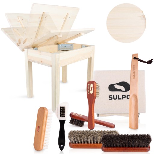 Solidny zestaw szczotek SULPO z włosiem końskim, umieszczonych w drewnianym sosnowym taborecie. Będzie łączył użyteczność oraz element dekoracyjny Twojego domu, mieszkania. Proponowany przez nas zestaw do pielęgnacji obuwia zawiera wszystko, co jest potrzebne do właściwego czyszczenia butów. Jeśli zależy Ci na utrzymaniu swojego obuwia w nieskazitelnym stanie i prezentowaniu się zawsze elegancko, to właśnie znalazłeś idealne narzędzie.