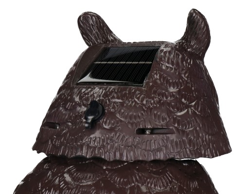 Ruchoma sowa solarna przeciw ptakom łączy w sobie aż 4 metody odstraszania. Makieta odstrasza ptaki swoją sylwetką, świecącymi oczami (są świetne zwłaszcza po zmroku), ruchomą głową oraz za pomocą głośnika wydającego ogłosy, których ptaki się boją.