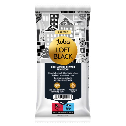 Luba Comfort Loft Black, 30 szt. Czyszczące, nawilżane ściereczki do czarnych i ciemnych powierzchni o pięknym, długotrwałym perfumowanym zapachu. Opóźniają osadzanie się kurzu oraz chronią przed działaniem czynników zewnętrznych. Wydobywają intensywność i naturalną głębię koloru z czyszczonych powierzchni oraz nadają im połysk. Duża, gruba wytrzymała ściereczka XXL nadaje się do wielokrotnego użytku po uprzednim jej wypłukaniu w czystej wodzie. Przebadane dermatologicznie.