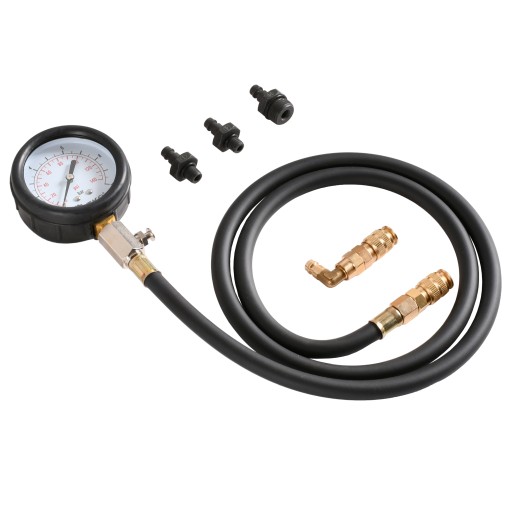- Manometr o zakresie 0 - 10 bar (0 - 140 psi) z przewodem elastycznym 1200mm zakończonym szybkozłączką.