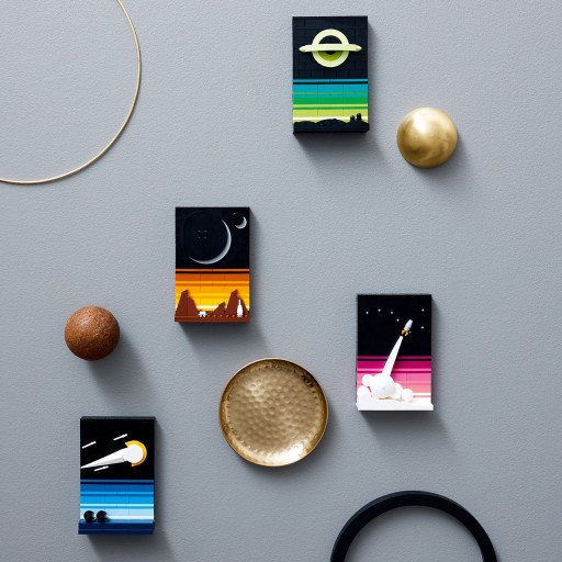 - Cztery pocztówki 3D z motywami kosmicznymi, które można połączyć (21340) – Opowieści z czasów wyścigu kosmicznego w stylu LEGO® to pocztówki do zbudowania inspirowane mitami, filmami, książkami i plakatami science fiction z lat osiemdziesiątych