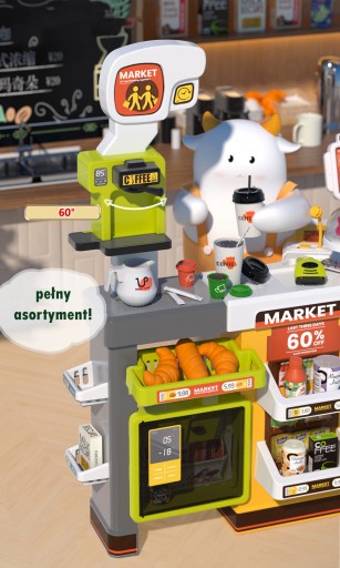 Sklep- market posiada otwieraną kasę, czytnik kart, skaner, mikrofon, wagę, półeczki, lodówkę oraz bardzo dużo atrap produktów spożywczych.