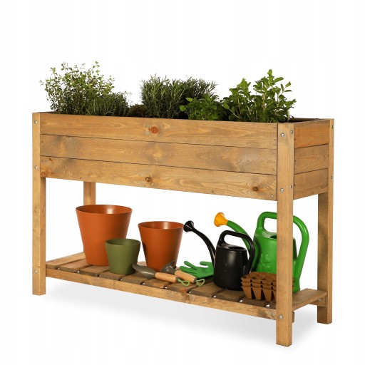 Drewniana donica balkonowa na nogach z półką - ekologiczny zielnik.