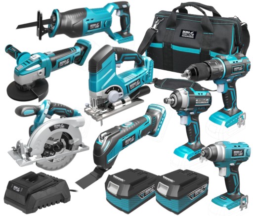 WIERTARKO-WKRĘTARKA UDAROWA, ZAKRĘTARKA UDAROWA, PILARKA TARCZOWA, WYRZYNARKA, SZLIFIERKA, WIERTARKA, URZĄDZENIE WIELOFUNKCYJNE, PILARKA SZABLASTA, 2 AKUMULATORY 4.0AH, ŁADOWARKA, TORBA