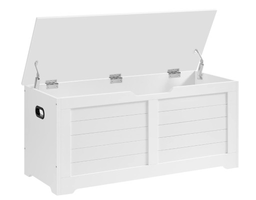 Ta skrzynia o wymiarach 100 x 40 x 46 cm oferuje wystarczająco dużo miejsca na ubrania, zabawki i buty; dzięki 2 zawiasom z funkcją bezstopniowego trzymania nie ma ryzyka przytrzaśnięcia palców