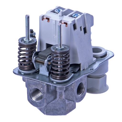 Przełącznik ciśnieniowy marki CONDOR, używany do utrzymywania ciśnienia w zbiorniku kompresora pomiędzy zadaną górną i dolną wartością ciśnienia. Sterownik przeznaczony do silników jednofazowych.