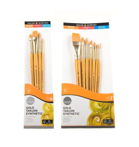 Zestaw pędzli artystycznych wysokiej jakości, wykonanych z syntetycznego włosa (GOLD TAKLON SYNTHETIC), dedykowanych do farb akrylowych. Produkcji znanej angielskiej firmy DALER ROWNEY oferującej akcesoria artystyczne od 1806 roku.