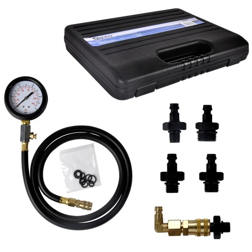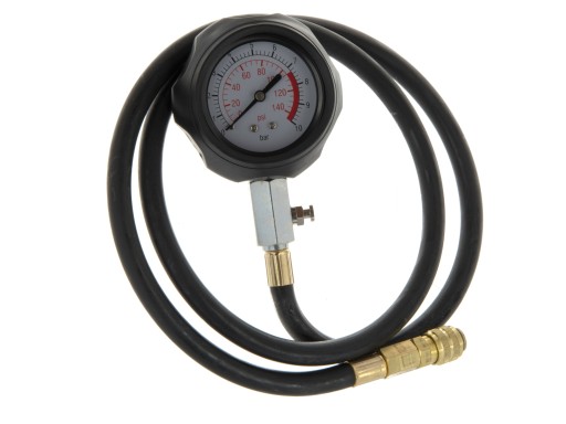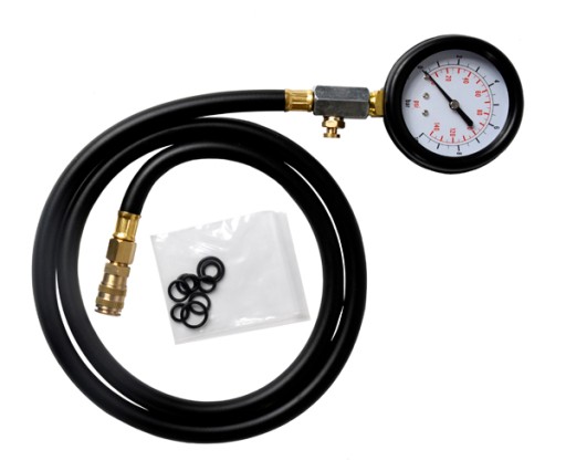 Zestaw wielu adapterów pozwoli na dobranie odpowiedniej końcówki. Manometr posiada gumowa osłonę co chroni go przed uszkodzeniem po upadku. Tester posiada długi elastyczny wąż.