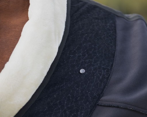 Luksusowa derka pokazowa wyposażona jest w gruby kołnierz z imitacji wełny oraz odpinane paski krzyżowe.